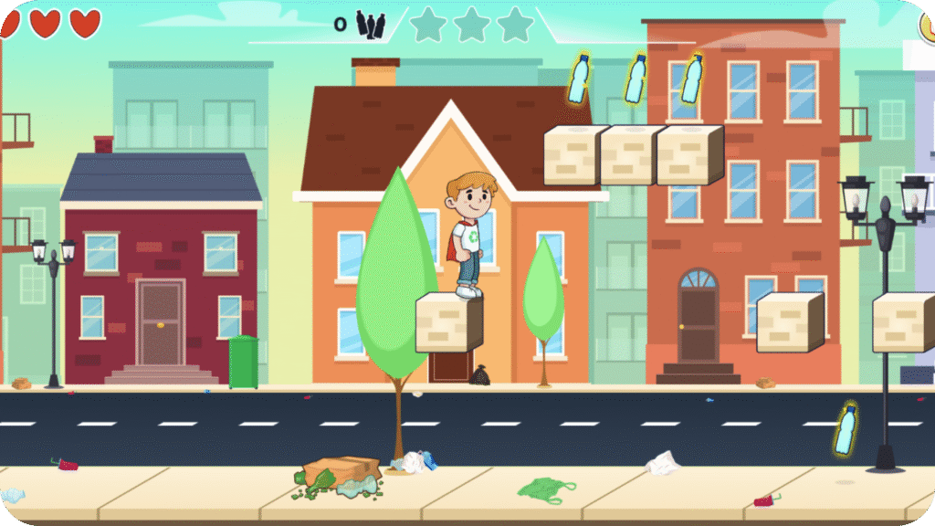 - La meccanica: Il giocatore controlla una super eroe del ricicolo in una città inizialmente invasa dai rifiuti. Raccogliendo bottiglie e saltando ostacoli, non solo accumula punti, ma vede l’ambiente cambiare graficamente: la città diventa pulita e luminosa.
